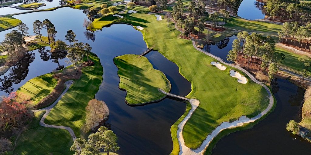 The peninsula green stirs memories of the par-3 17th at TPC Sawgrass. Shadows falling over the putting surface only add to the drama on this Tom Fazio-Lanny Wadkins classic.